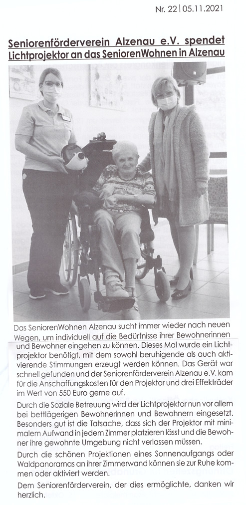 Seniorenförderverein spendet Lichtprojektor an das Seniorenwohnen Alzenau