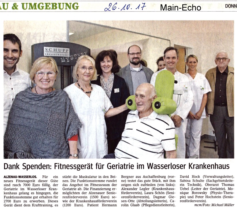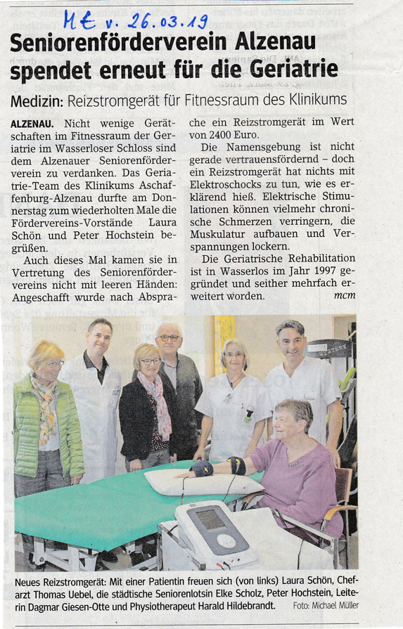 Seniorenförderverein Alzenau spendet erneut für die Geriatrie Reizstromgerät für Fitnessraum des Klinikums