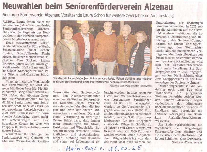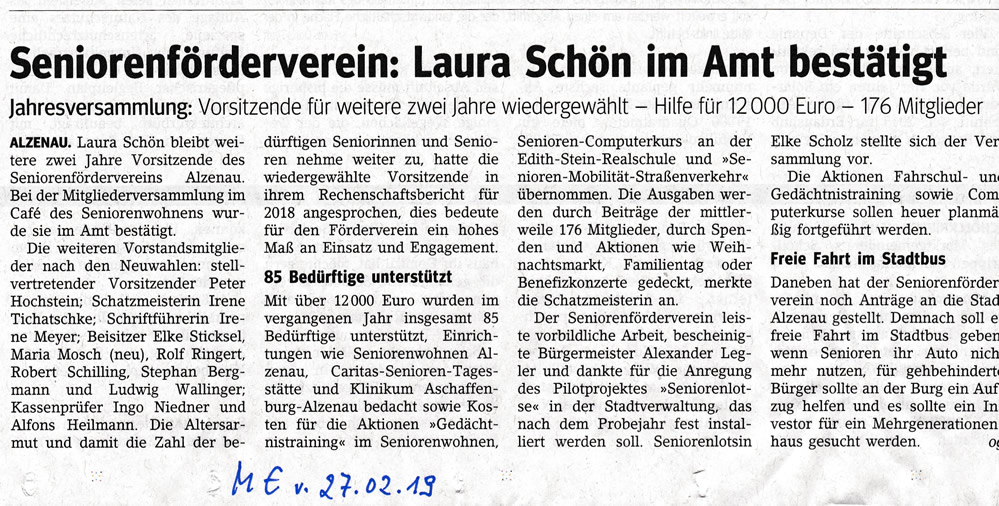 "Neuwahlen beim Seniorenförderverein Alzenau" Vorsitzende Laura Schön für wietere zwei Jahre im Amt bestätigt