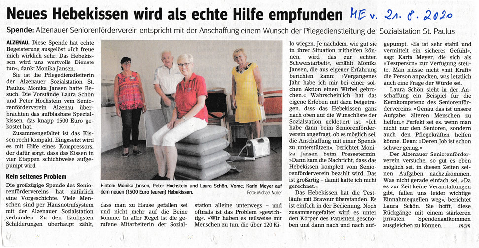 Neues Hebekissen wird als echte Hilfe empfunden Spende: Alzenauer Seniorenförderverein entspricht mit der Anschaffung einem Wunsch der Pflegedienstleitung der Sozialstation St. Paulus