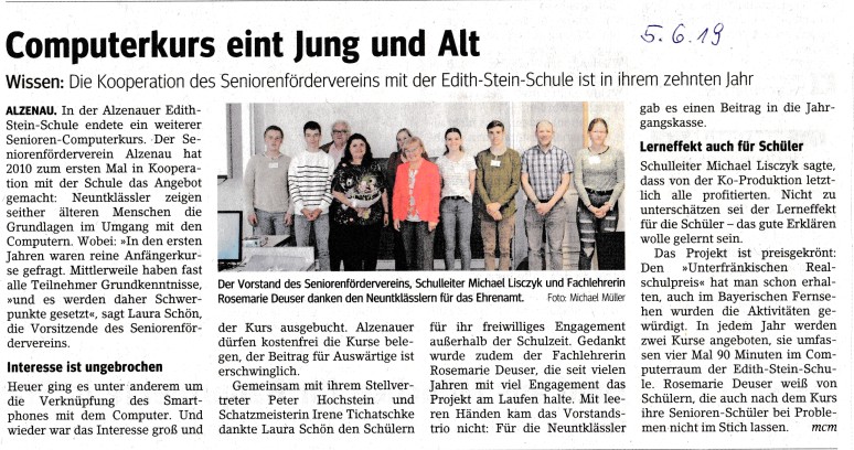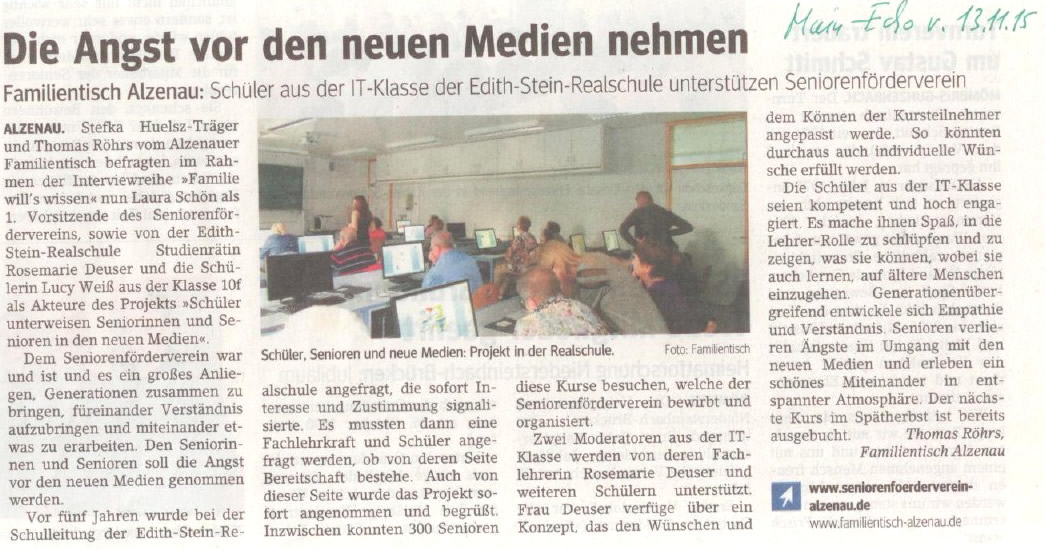 "Die Angst vor den neuen Medien nehmen" Familientisch Alzenau: Schüler aus der IT-Klasse der Edith-Stein-Realschule unterstützen Seniorenförderverein