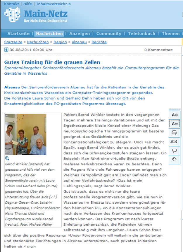 Gutes Training für die grauen Zellen - Spendenübergabe: Seniorenförderverein Alzenau bezahlt ein Computerprogramm für die Geriatrie Wasserlos