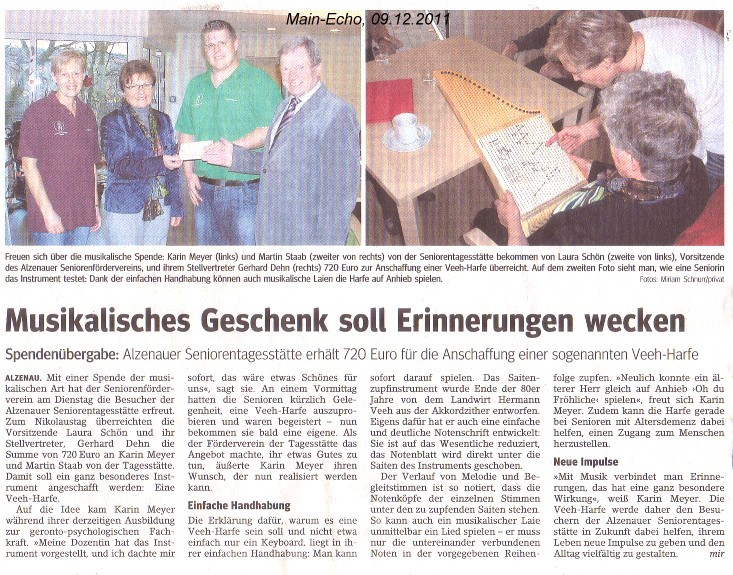 Musikalisches Geschenk soll Erinnerungen wecken Spendenübergabe: Alzenauer Seniorentagesstätte erhält 720 Euro für die Anschaffung einer sogenannten Veeh-Harfe