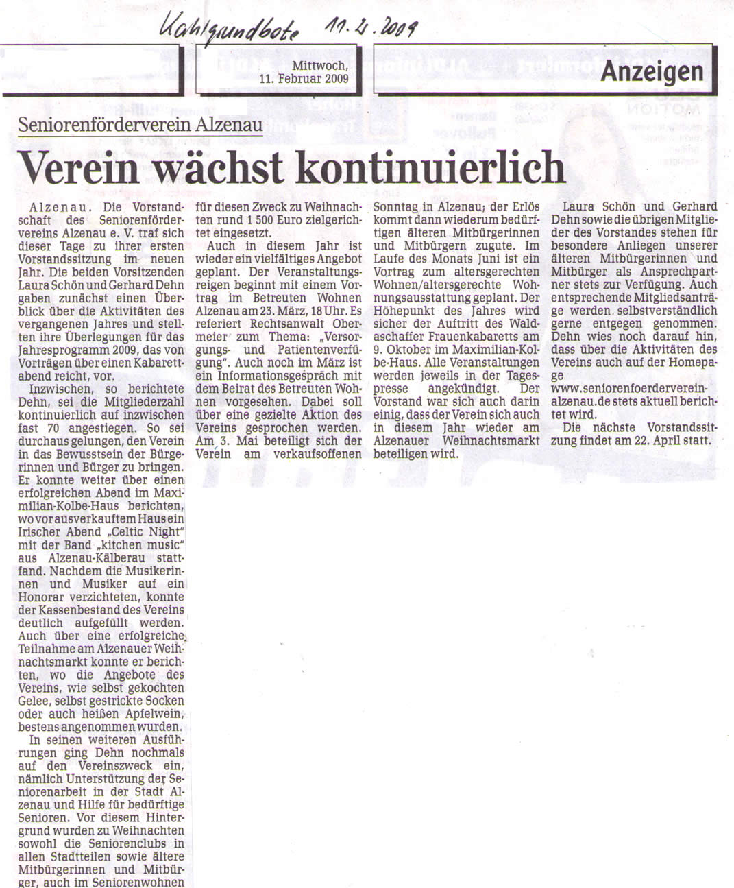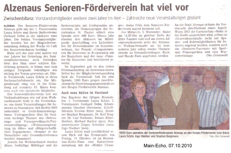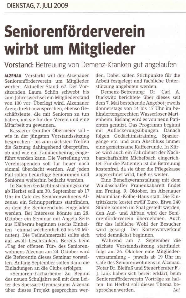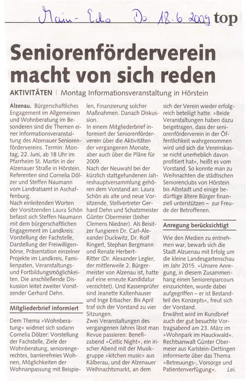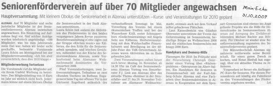 Seniorenförderverein auf über 70 Mitglieder angewachsen - Hauptversammlung: Mit kleinem Obolus die Seniorenarbeit in Alzenau unterstützen - Kurse und Veranstaltungen für 2010 geplant
