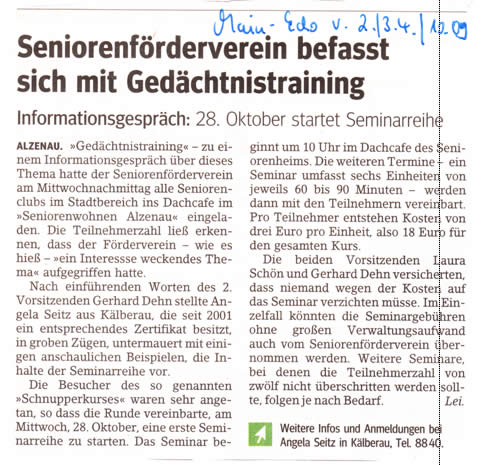 Seniorenförderverein befasst sich mit Gedächtnistraining - Informationsgespräch: 28. Oktober startet Seminarreihe