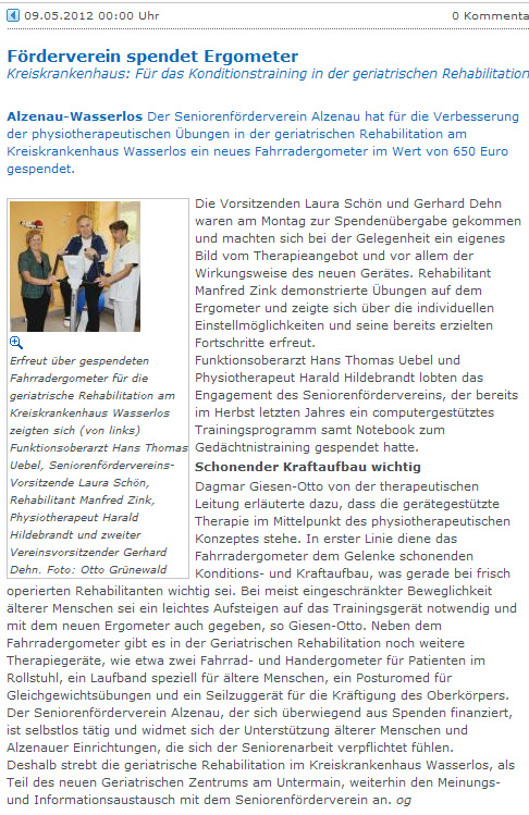 "Spende: Motomed für Senioren " Die Bewohner im Seniorenwohnen Alzenau können seit einigen Wochen ihre Fitness mit Hilfe eines Motomeds der Firma Reck steigern. Ermöglicht wurde der Kauf des 3000 Euro teuren Geräts durch eine Spende des Seniorenfördervereins in Höhe von 1500 Euro...