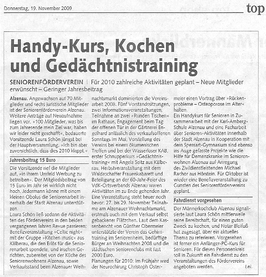 Handy-Kurs, Kochen und Gedächtnistraining - Seniorenförderverein: Für 2010 zahlreiche Aktivitäten geplant - Neue Mitglieder erwünscht - Geringer Jahresbeitrag