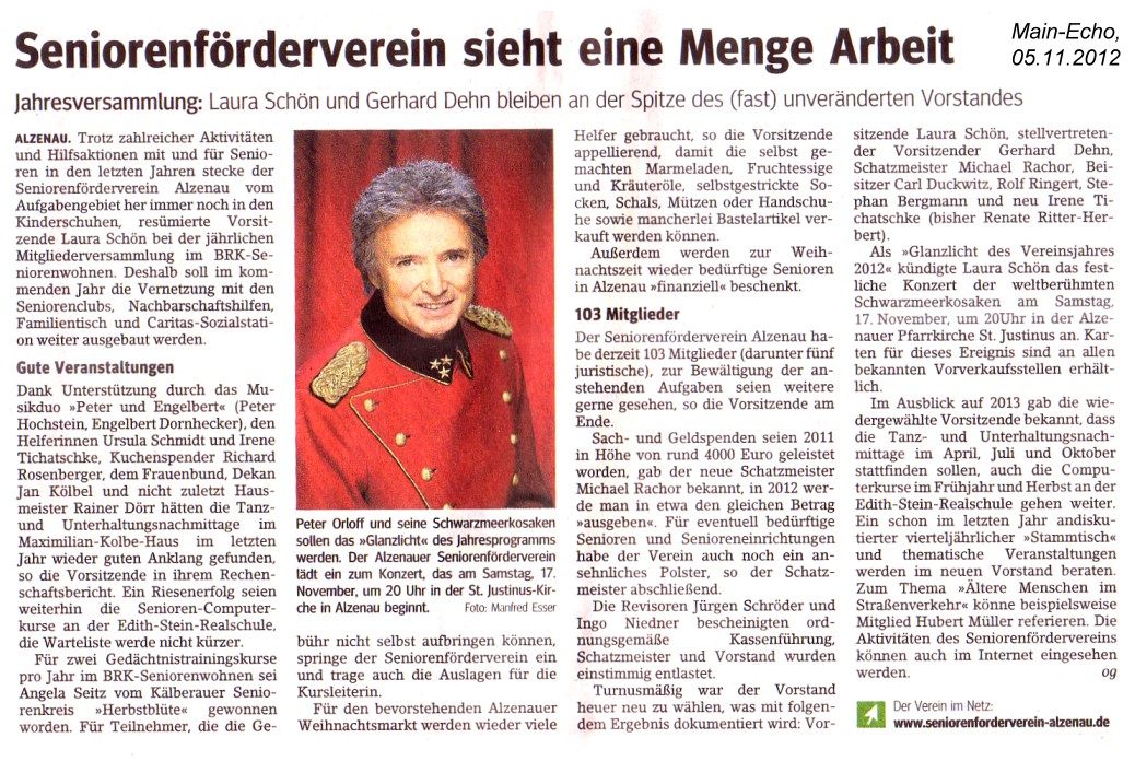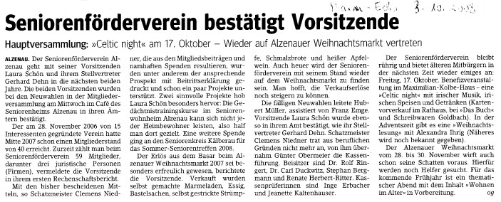 Seniorenförderverein bestätigt Vorsitzende - Hauptversammlung: "Celtic Night" am 17. Oktober - Wieder auf Alzenauer Weihnachtsmarkt vertreten
