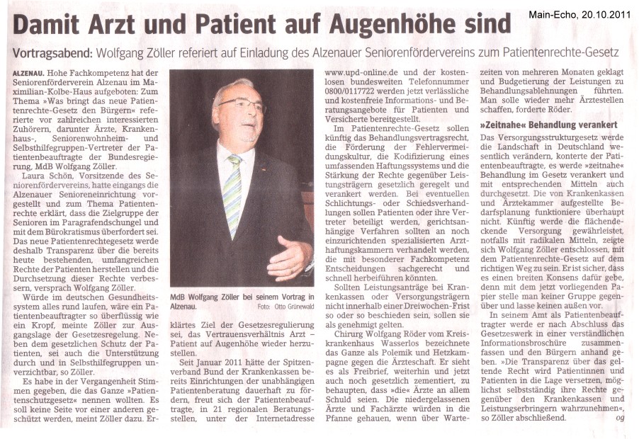 Damit Arzt und Patienten auf Augenhöhe sind - Vortragsabend:Wolfgang Zöller referiert auf Einladung des Alzenauer Seniorenfördervereins zum Patientenrechte-Gesetz