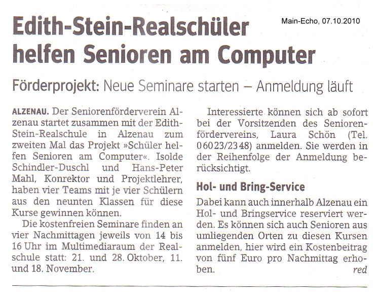 Edith-Stein-Realschüler helfen Senioren am Computer - Förderprojekt: Neue Seminare starten - Anmeldung läuft