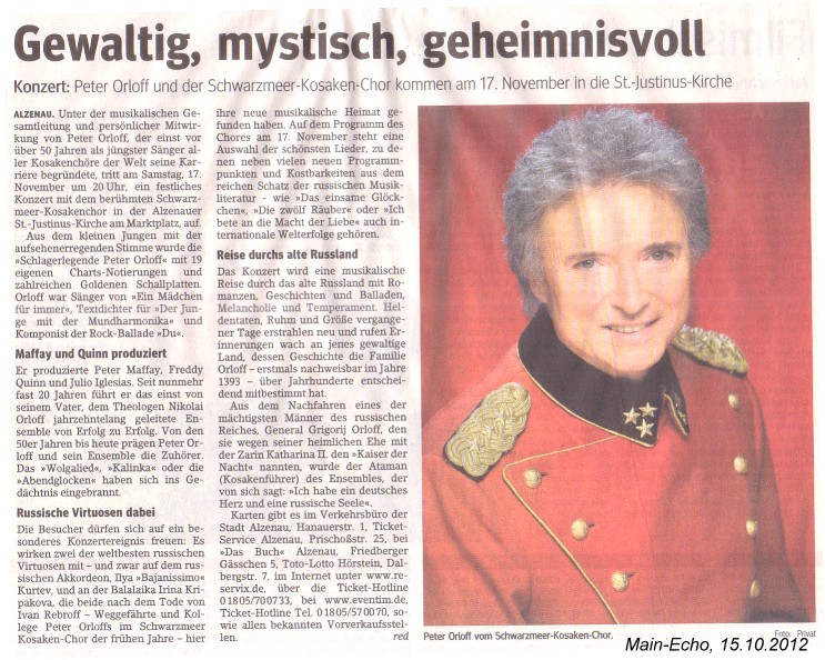 15. November, um 20 Uhr in der Alzenauer St.-Justinus-Kirche. Orloff, der einst als jüngster Sänger aller Kosakenchöre - übrigens gemeinsam mit Ivan Rebroff - im Schwarzmeer-Kosaken-Chor seine Karriere begründete, leitet das festliche Konzert.