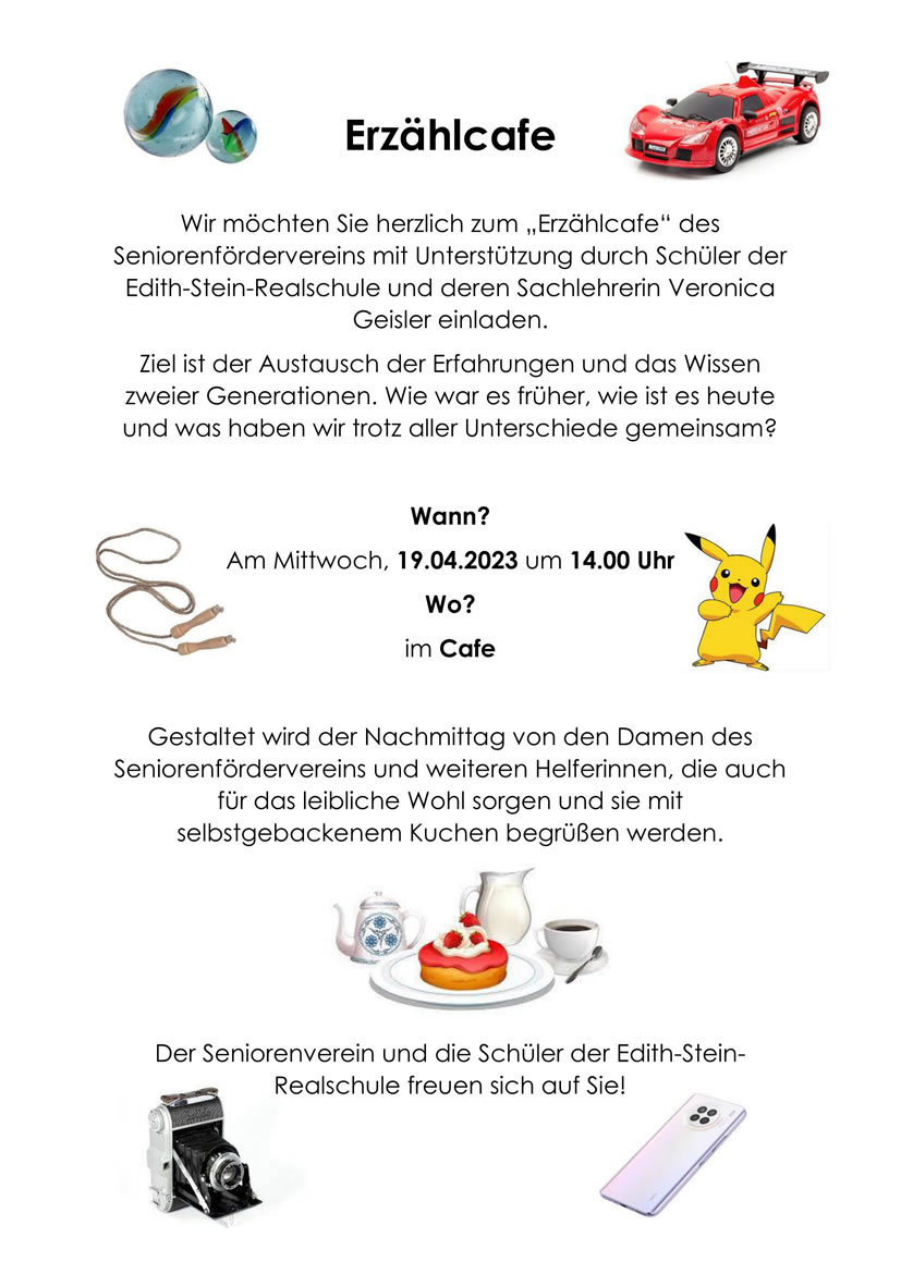 Eine Kooperationsveranstaltung mit der Edith-Stein-Realschule im Cafe des SW Bachstraße 2, Alzenau bei Kaffee, Tee und Kuchen unterhalten sich Schüler/innen mit Senioren/innen über verschiedene Lebenssituationen, wie sie erlebt werden und erlebt wurden. |