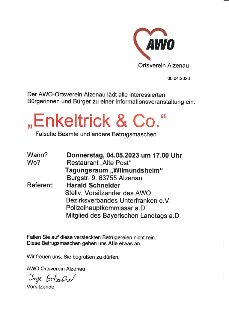 Anmeldungen werden ab sofort bei Laura Schön, Tel. 06023/2348 oder per E-Mail: info@seniorenfoerderverein-alzenau.de entgegengenommen. |