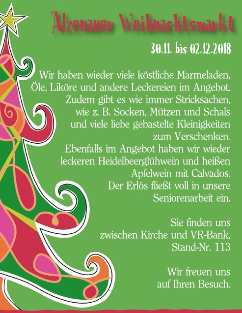1. Adventswochenende (01.-03.12.2023) mit einer Bude vertreten und bietet u.a. handgestrickte Socken, Mützen, Schals an.